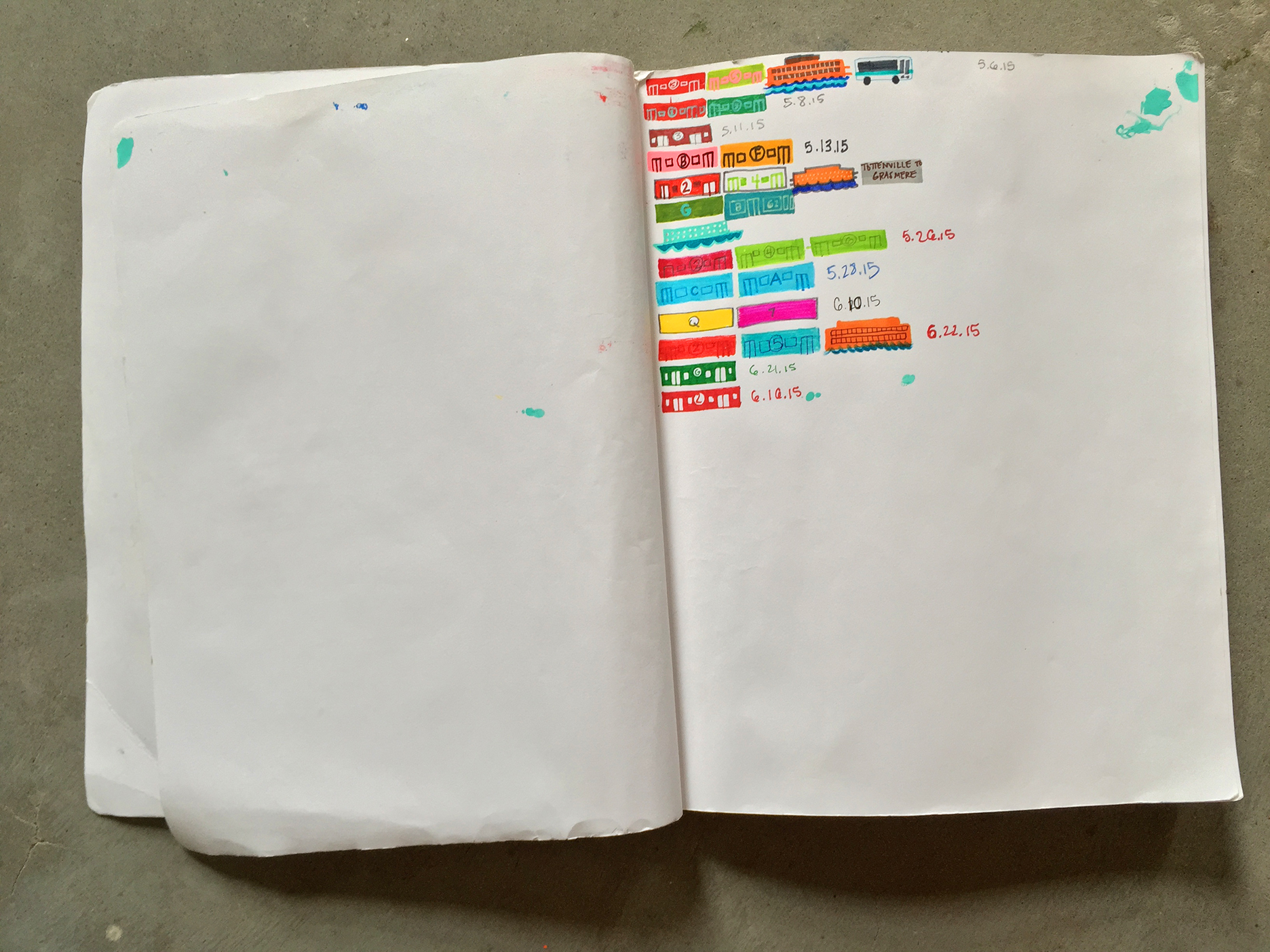 Finding ways to tell the stories of my walks more thoroughly has been on my mind a lot lately. There are a number of small works in progress. My sketchbook is something I can share. The transit to each walk is fairly significant, so this has kept me engaged and conspicuous. Hopefully it will inspire those I share the train with on these rides to color or create.